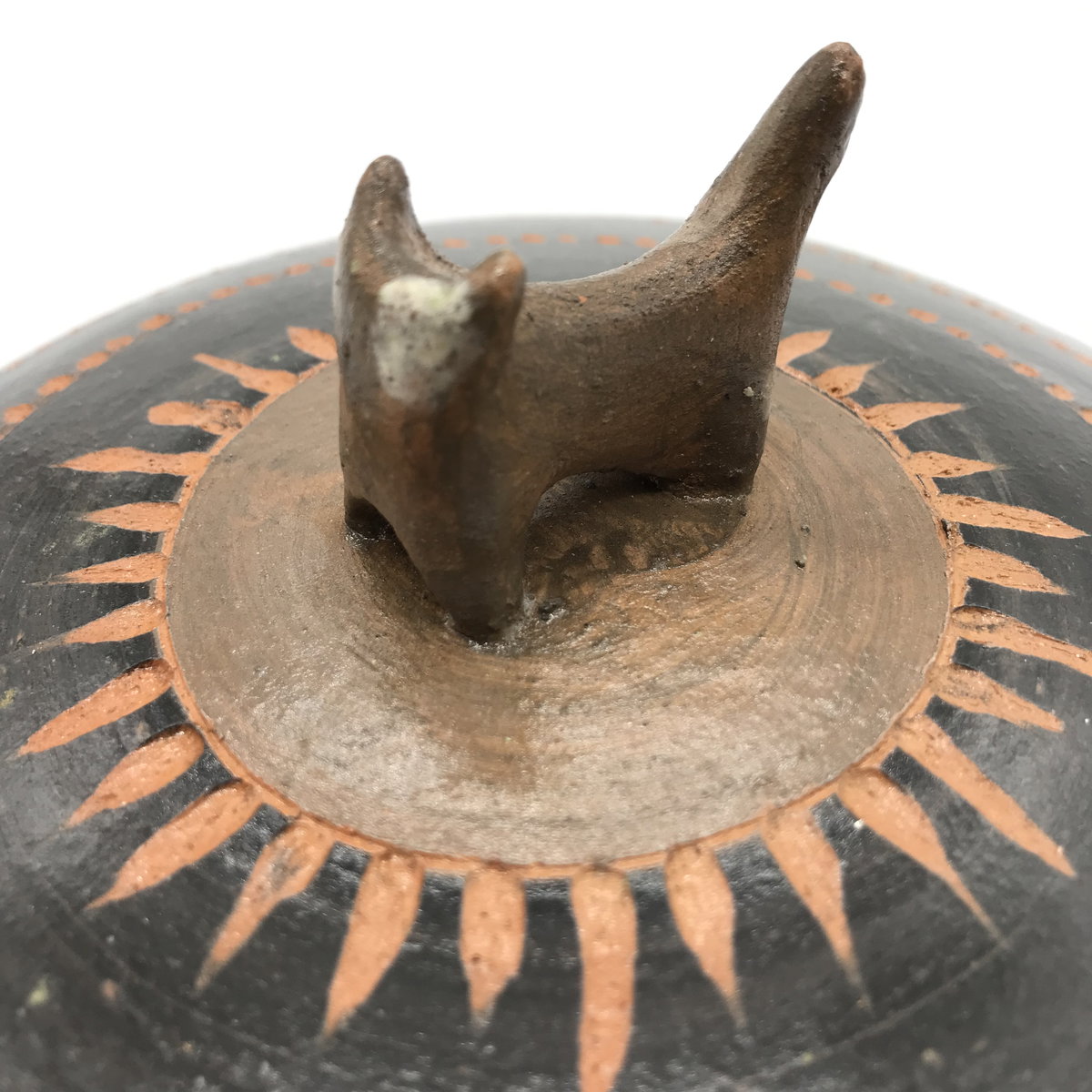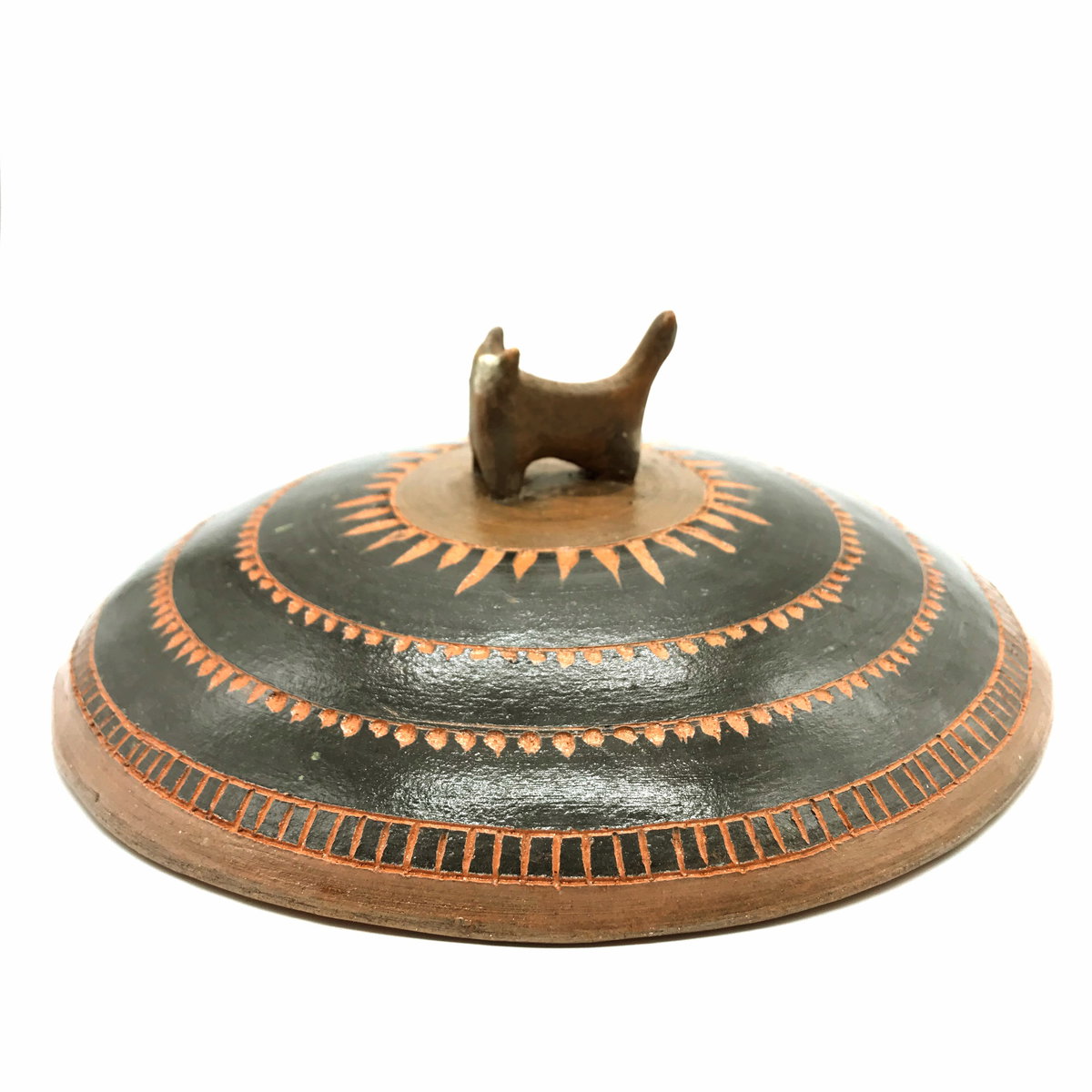 Esta tapa está coronada por la figura de un gato, animal sagrado en múltiples culturas, símbolo de misterio, intuición, independencia y protección espiritual. El gato representa la capacidad de ver en la oscuridad, de atravesar velos y mantener la claridad aun en medio de lo oculto. Es guardián de los hogares y de los mundos invisibles, asociado al poder femenino, la noche y la magia.