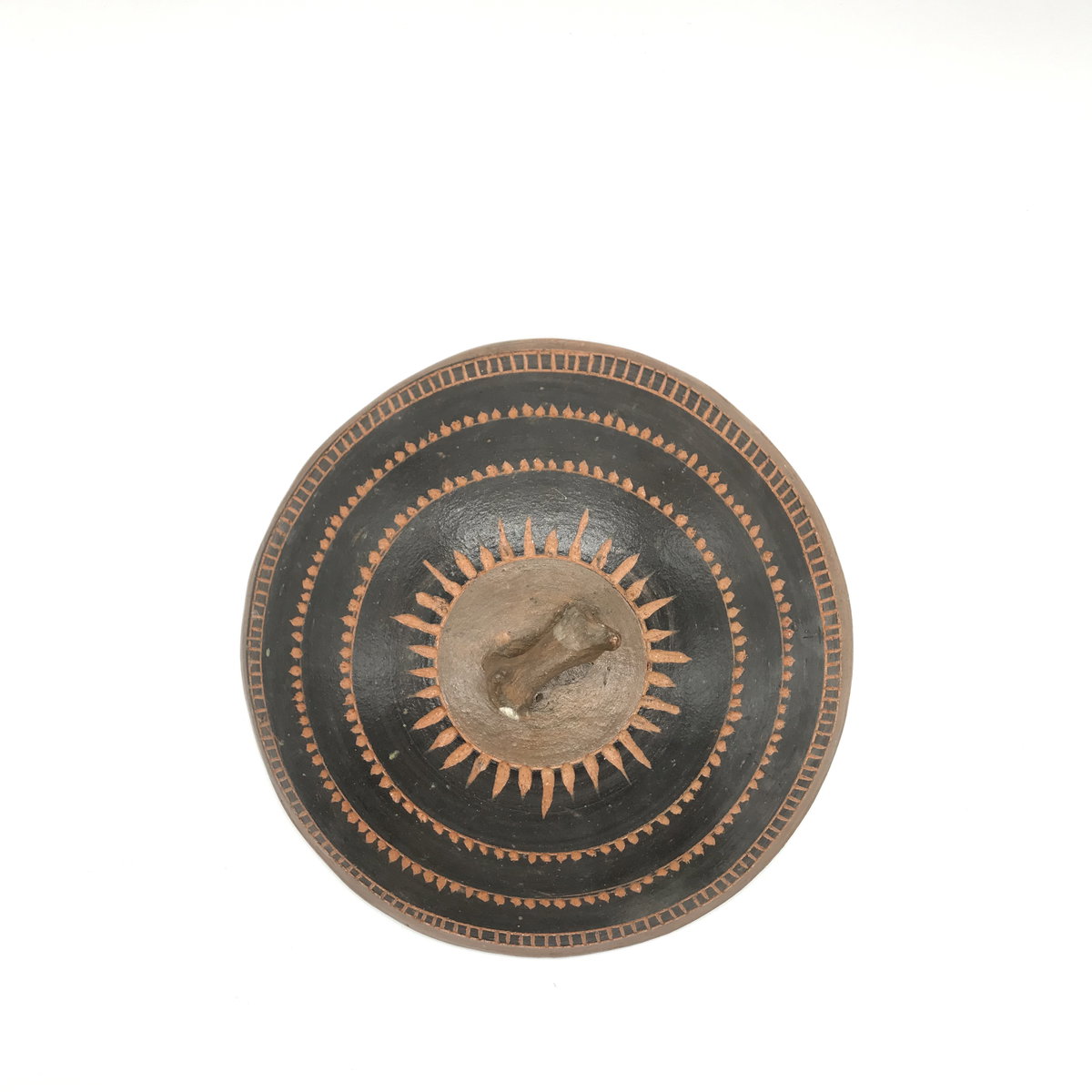 El fondo negro, profundo y protector, está rodeado por anillos de geometrías solares en terracota, que evocan rayos de luz irradiando desde el centro. Este contraste entre oscuridad y luz expresa el equilibrio entre lo visible y lo invisible, lo racional y lo intuitivo, lo material y lo espiritual.