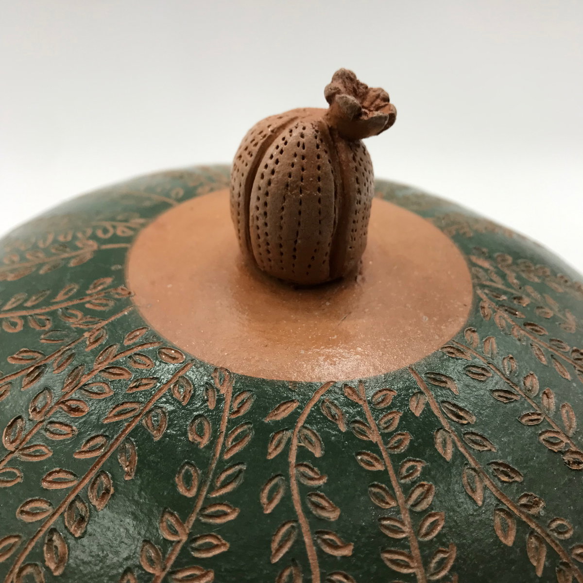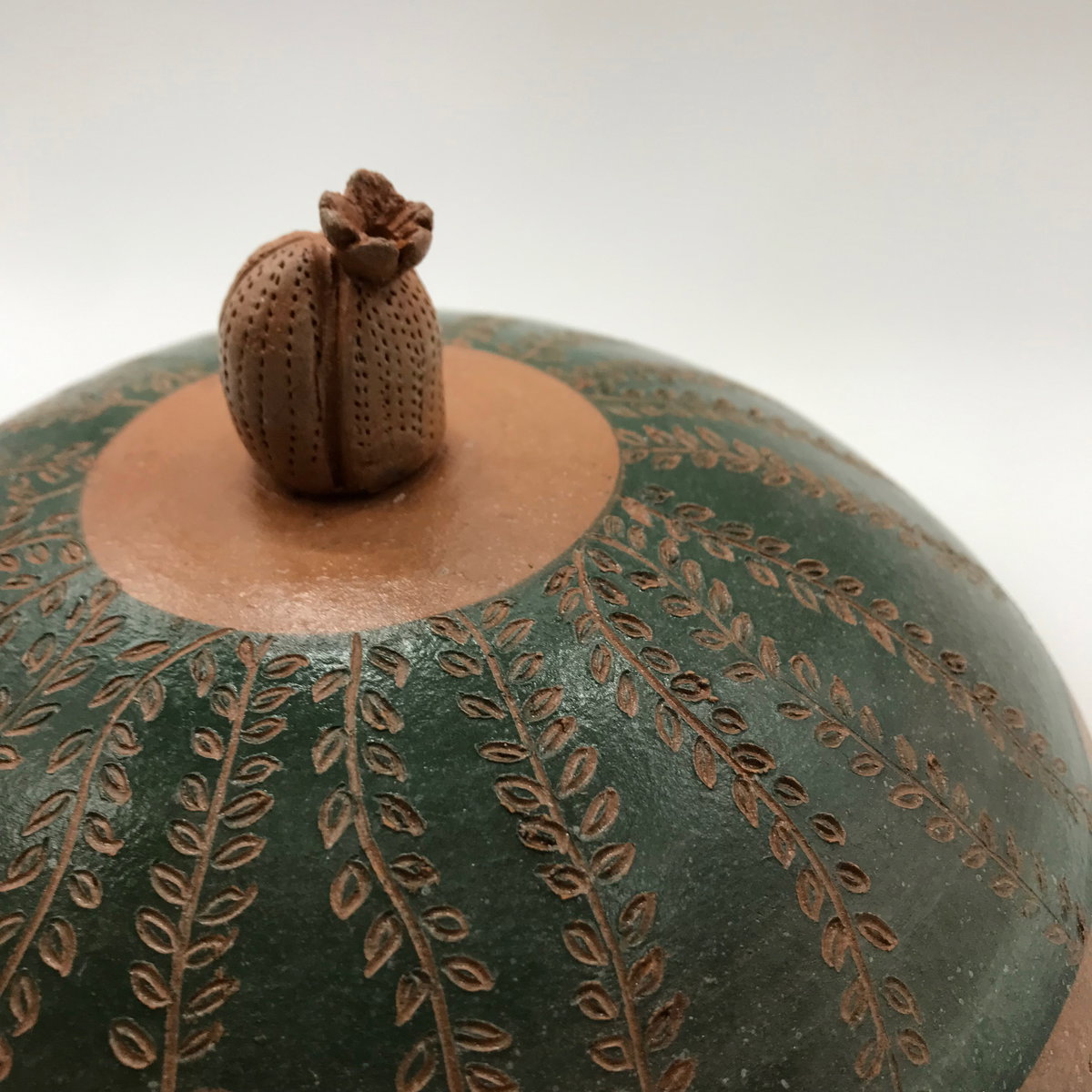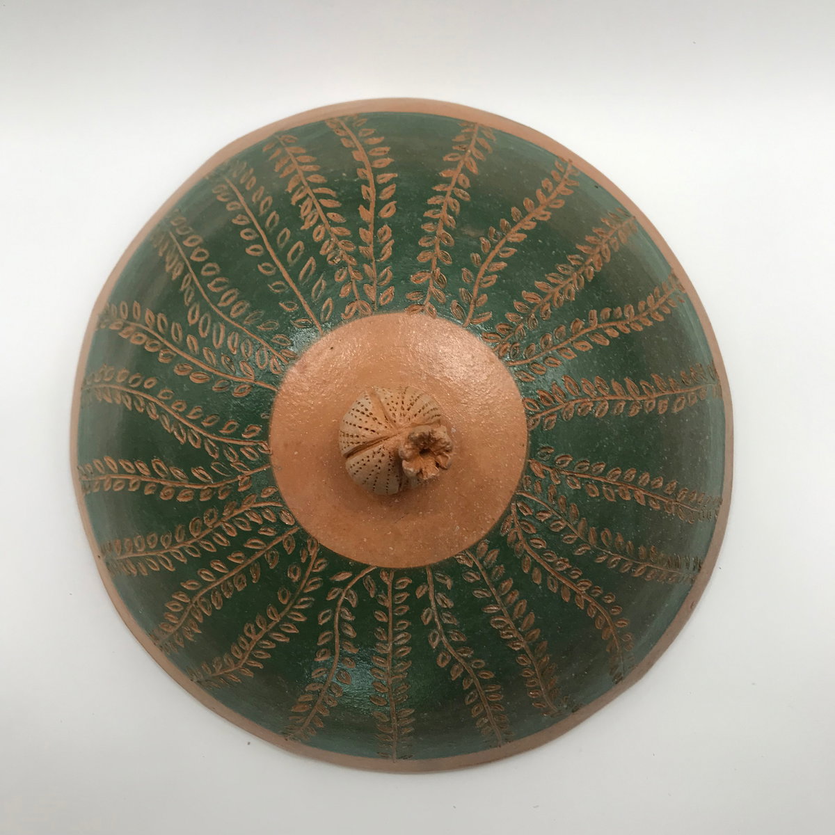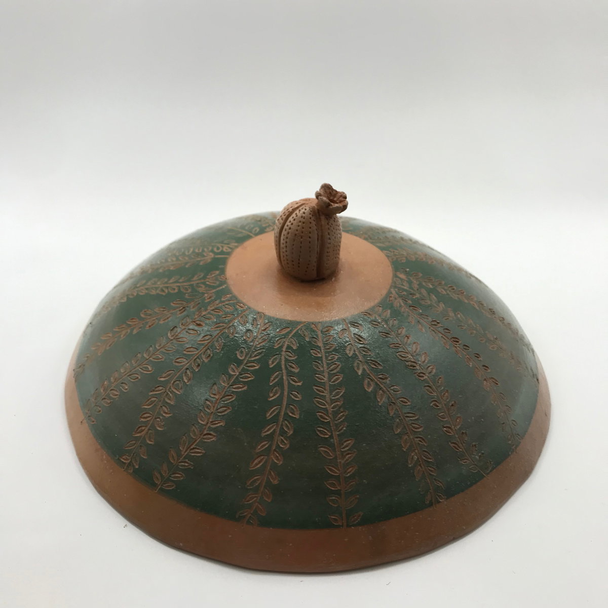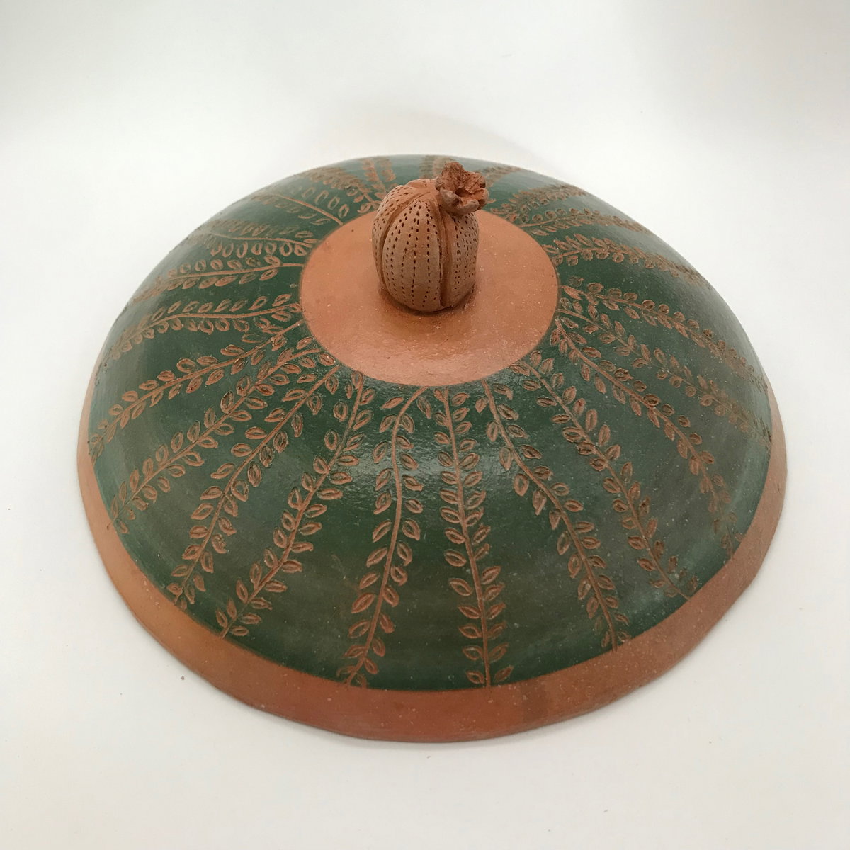 Tapa de cerámica engobada en tono verde, con esgrafiado de hojitas y asa en forma de cactus en flor.