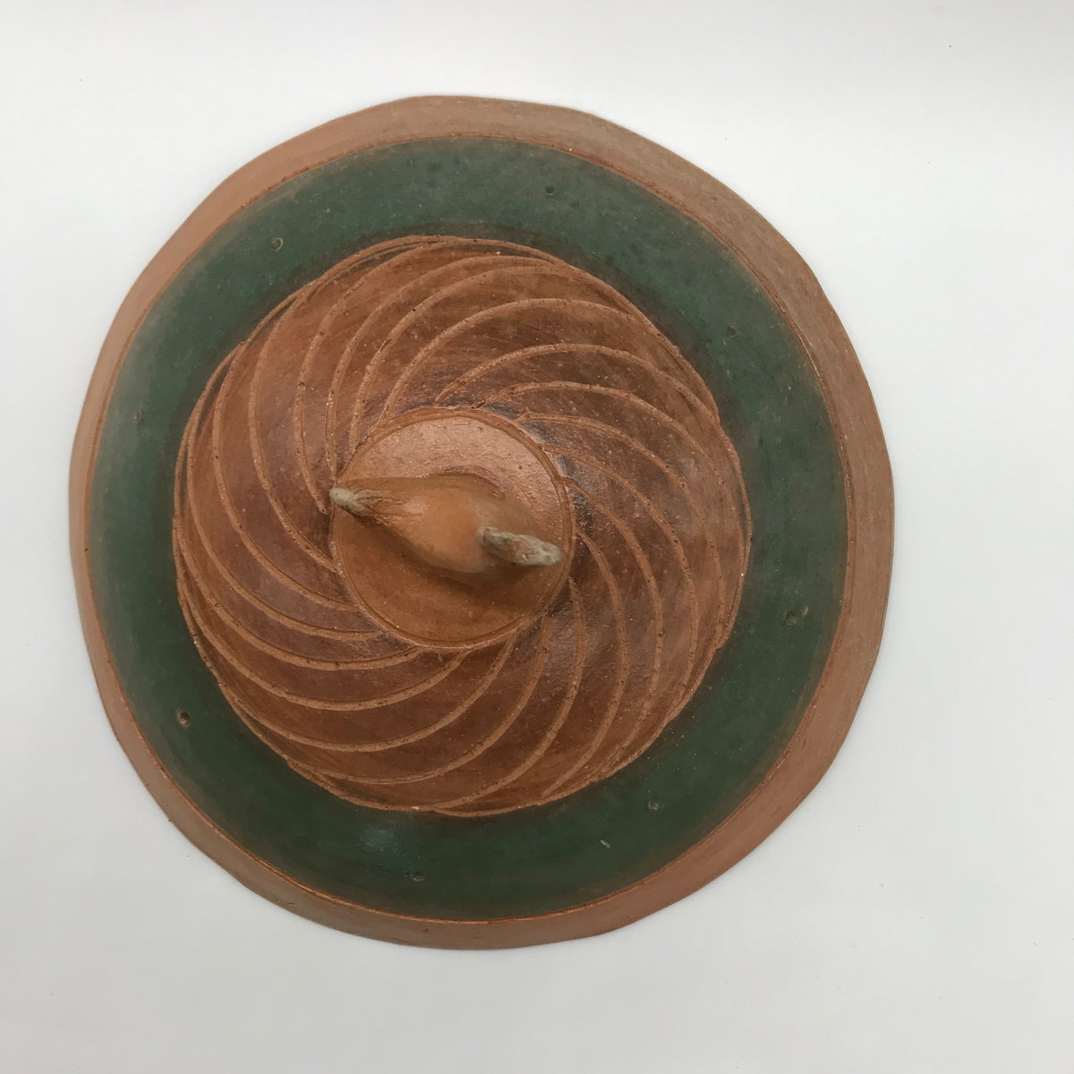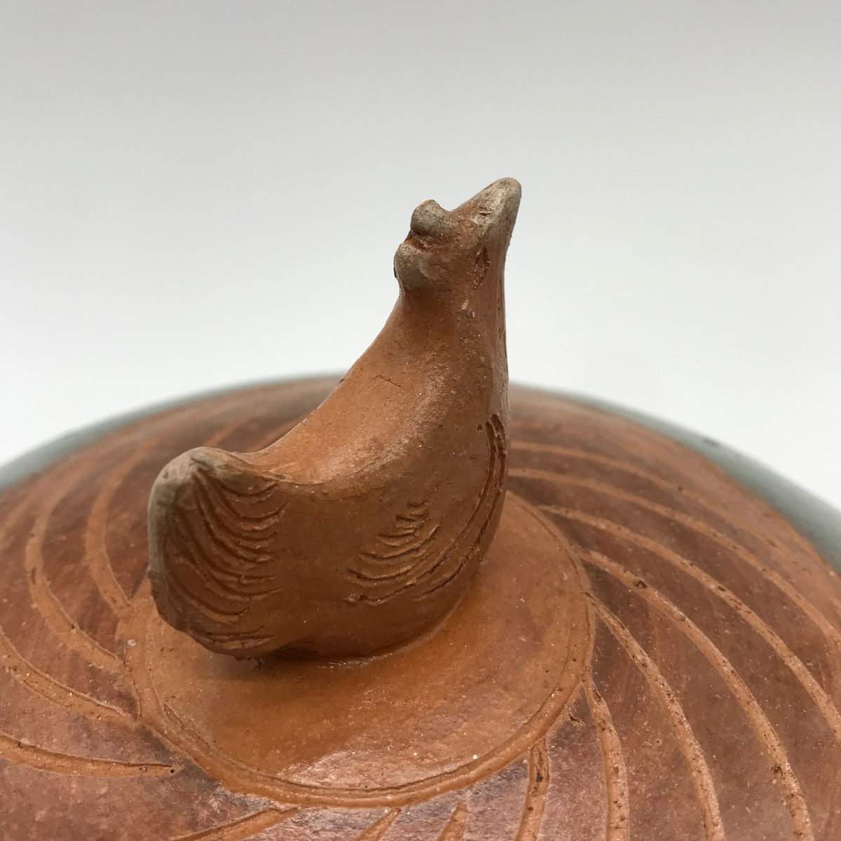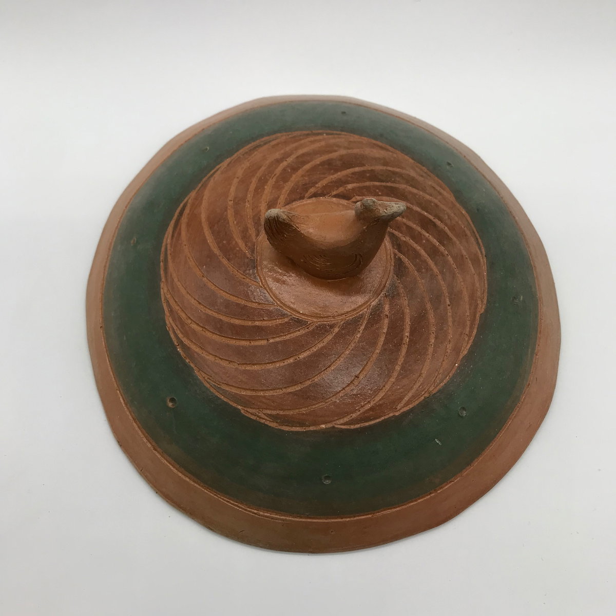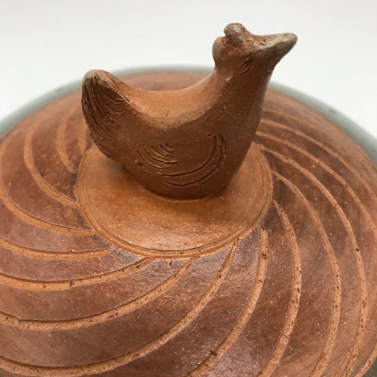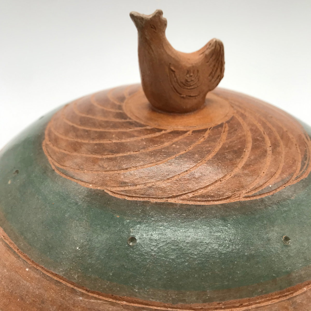 La figura de la gallina simboliza el hogar, la abundancia y el cuidado cotidiano. Los grabados en espiral evocan el movimiento del agua y la energía que circula. Una pieza que celebra lo simple y lo vital: el agua, la tierra y la vida doméstica.