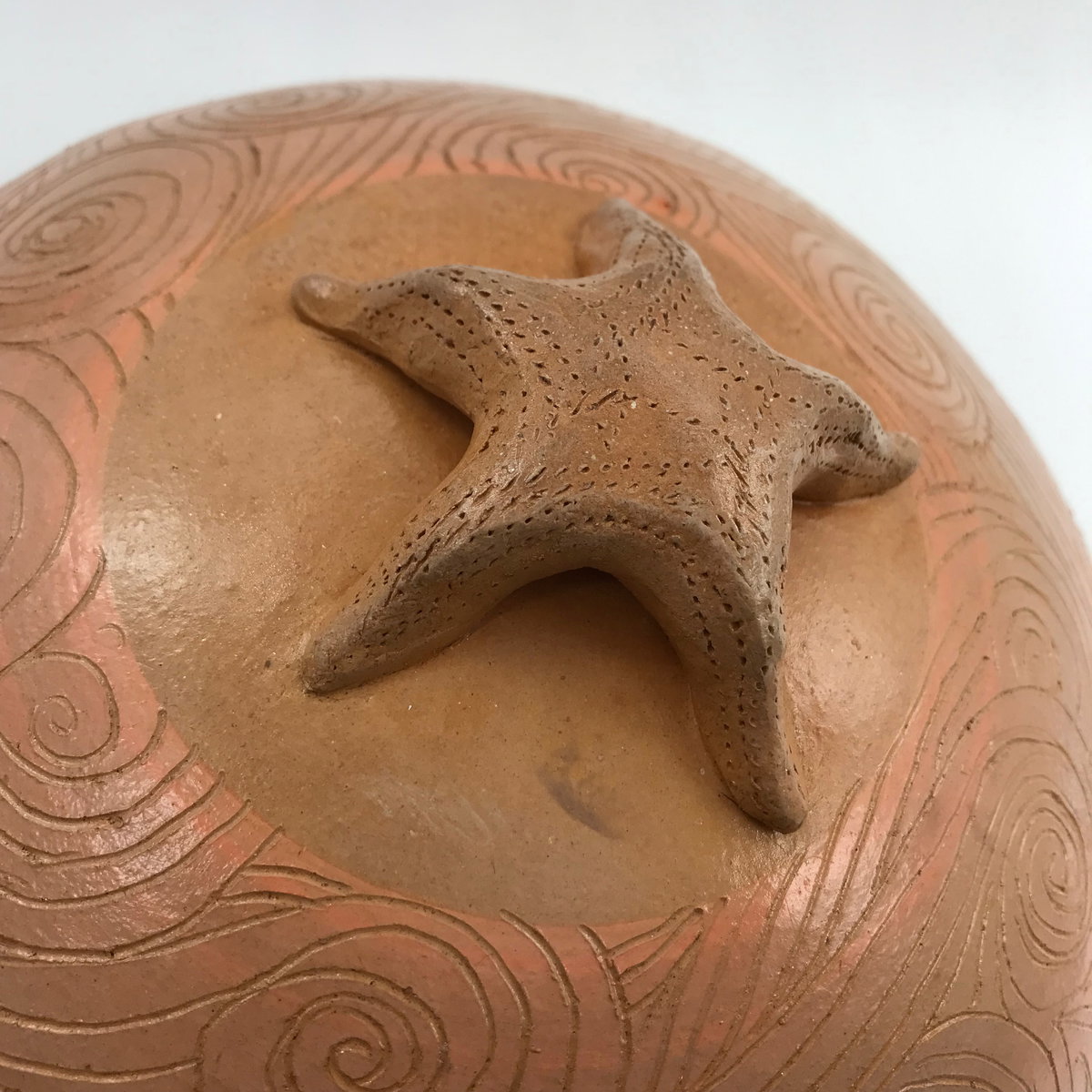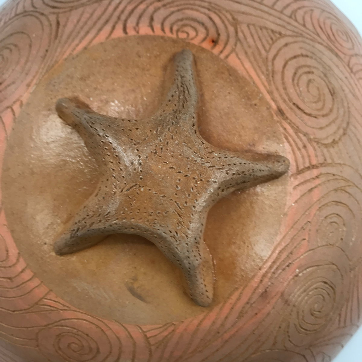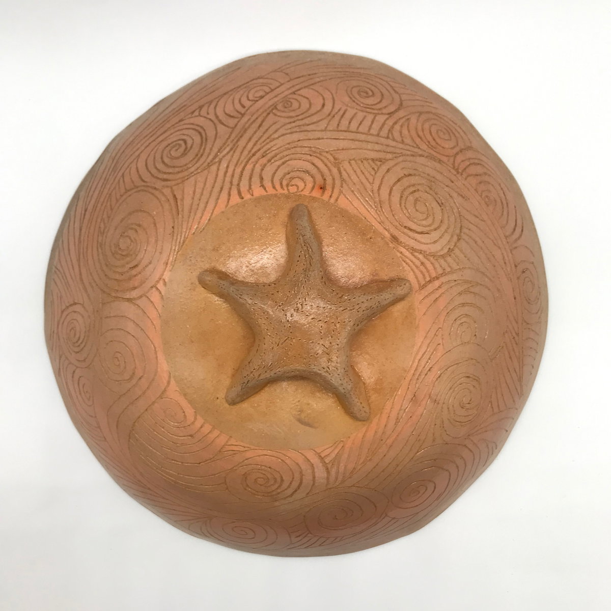 El relieve central evoca una estrella de mar, símbolo de armonía y regeneración. Los trazos en espiral representan el movimiento del agua y el fluir constante de la vida. Una pieza que conecta el origen marino con la pureza del agua en casa.