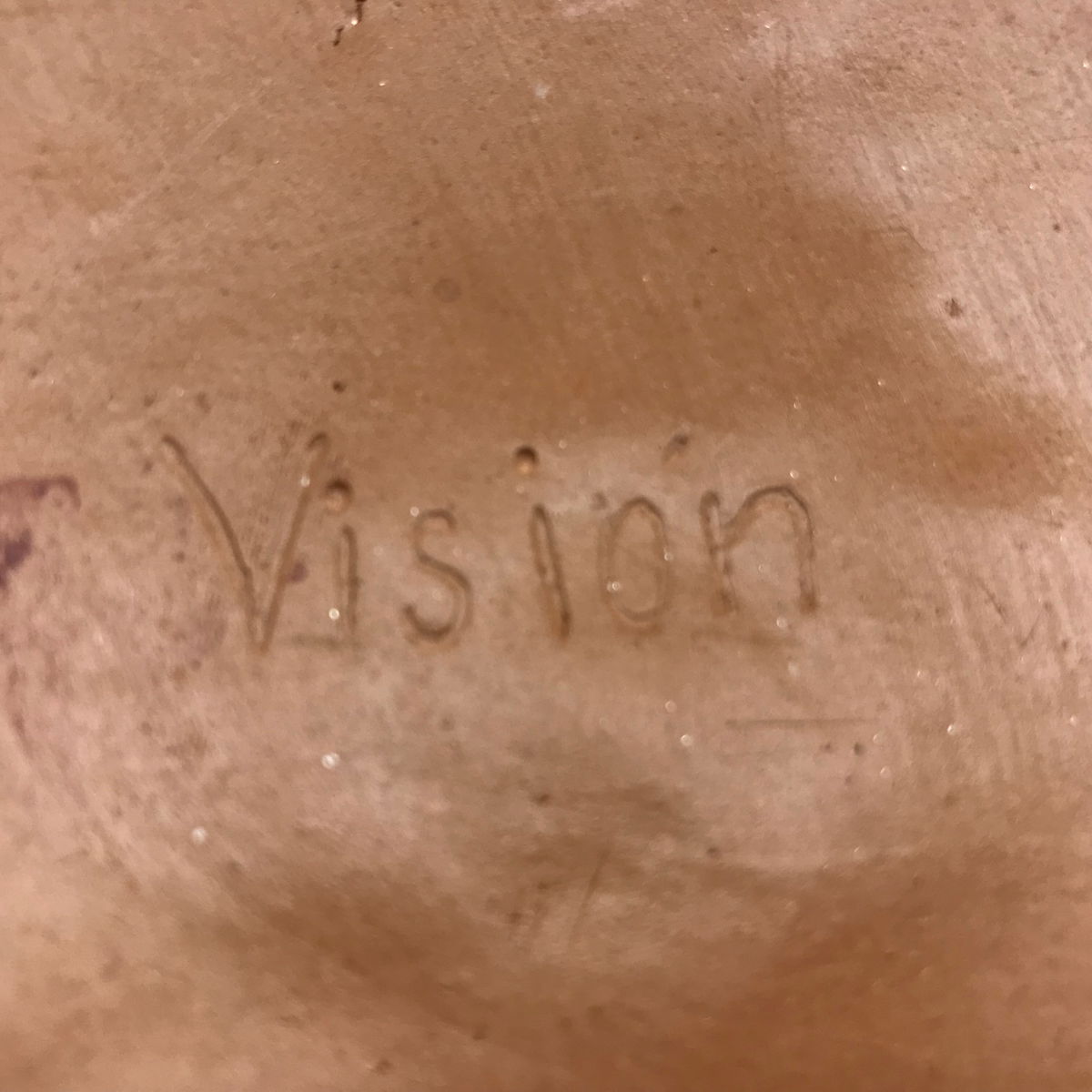 En el centro, la palabra esgrafiada “visión” queda orientada hacia el interior de la vasija, en contacto directo con el agua que se filtra. No es una palabra para ser leída, sino ofrecida al agua. Allí actúa como una intención silenciosa: claridad, discernimiento, mirada amplia. El agua atraviesa esa palabra y la lleva consigo, transformada en gesto cotidiano.