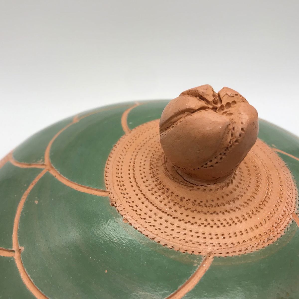 El asa en forma de peyote alude a las plantas maestras y a los saberes originarios que expanden la percepción más allá de lo evidente. El peyote no simboliza evasión, sino revelación: la capacidad de ver lo que normalmente permanece oculto, de recordar la conexión entre lo visible y lo invisible.