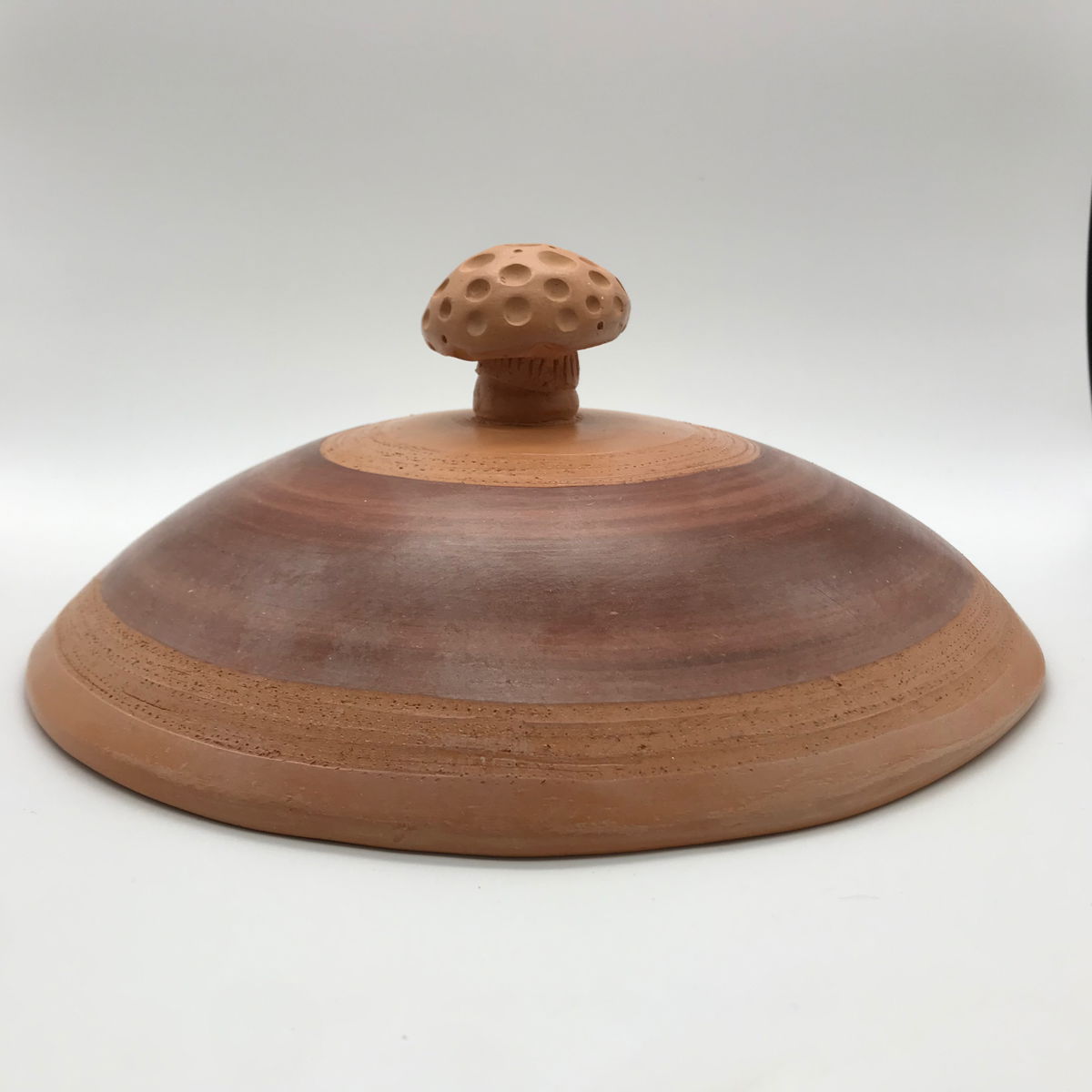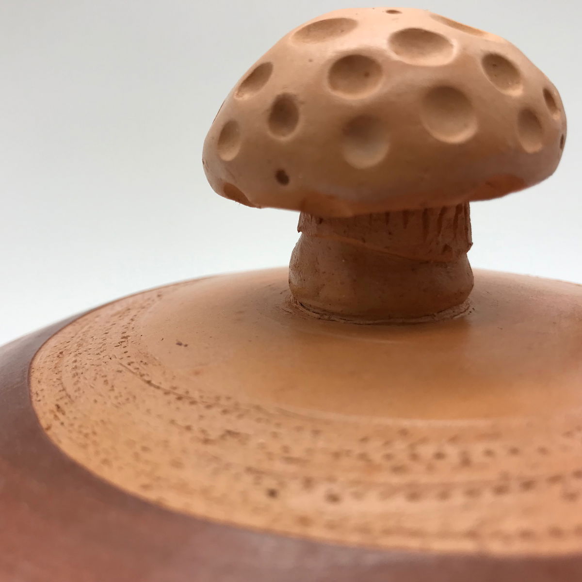 El asa elevada, con forma de hongo amorfo, aparece como una presencia surgida de la tierra misma. Su superficie está cubierta de pequeños hundimientos circulares, como poros, respiraciones o células. No es una figura ornamental: parece crecer desde la tapa, recordando los ritmos silenciosos del mundo subterráneo.