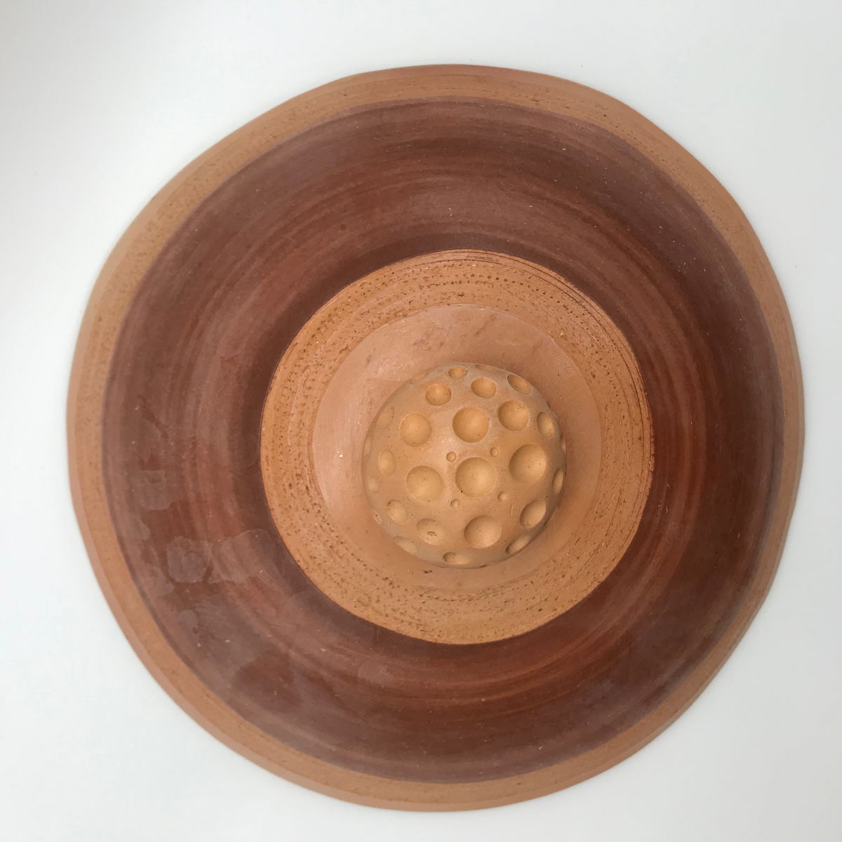 Esta tapa está marcada por un lenguaje orgánico y primitivo. Los puntitos esgrafiados que forman cÃrculos concéntricos en el borde y en el interior de la franja central evocan semillas, esporas, gotas, huellas mÃnimas que se repiten y se expanden. No hay lÃneas duras: todo nace de la repetición paciente.