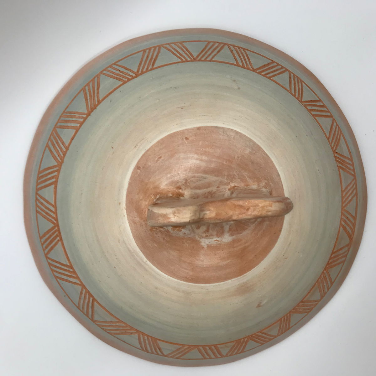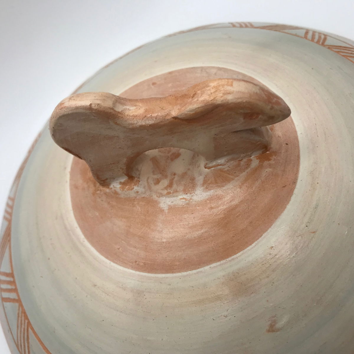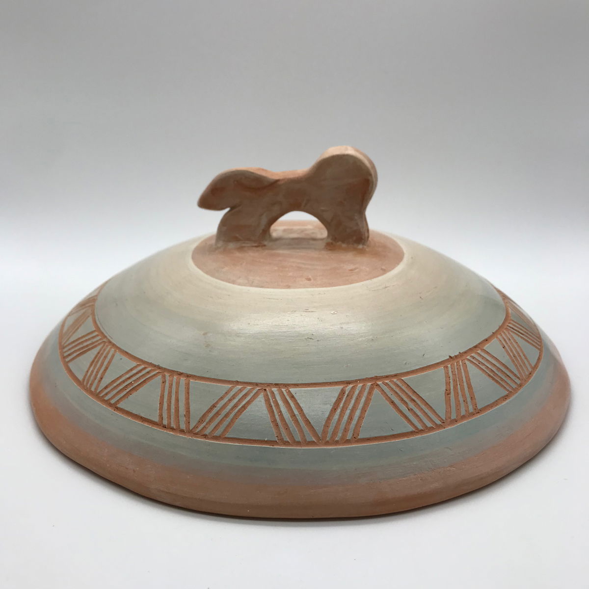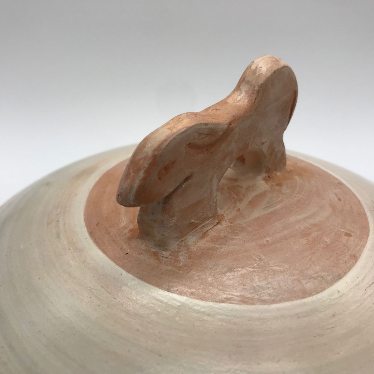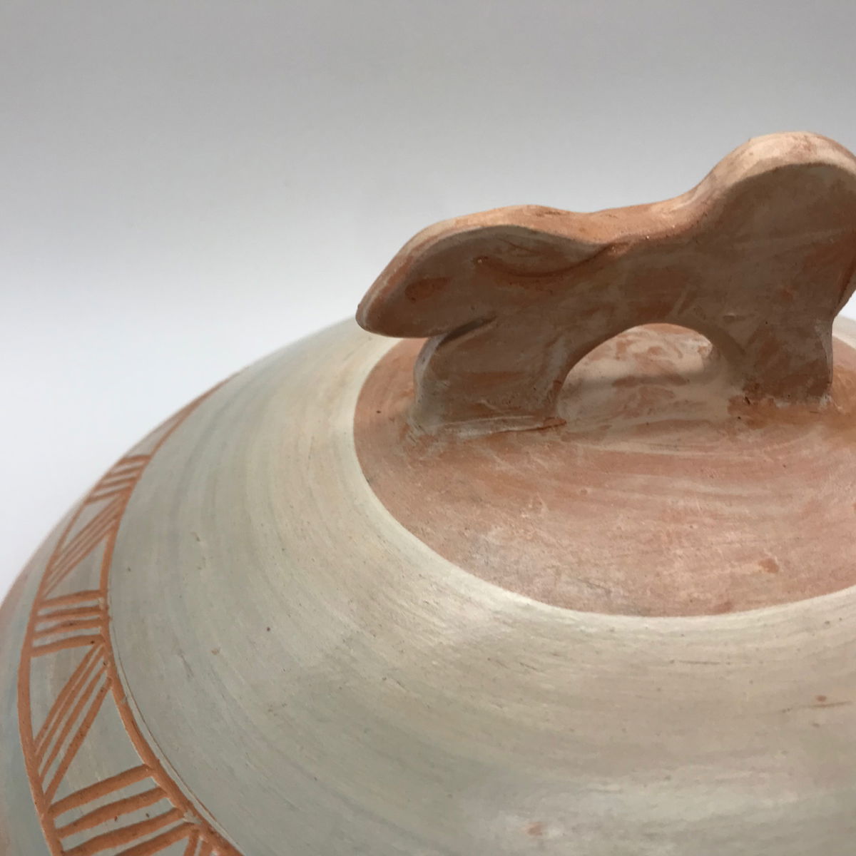 El asa de esta tapa representa un animal indefinido, una figura que no se deja nombrar del todo. Puede evocar un conejo, un pequeño guardián o un ser mítico. Esa ambigüedad no es un vacío: es una puerta simbólica. En muchas culturas antiguas, los animales que no se identifican con precisión pertenecen al mundo de los espíritus protectores y los relatos orales.