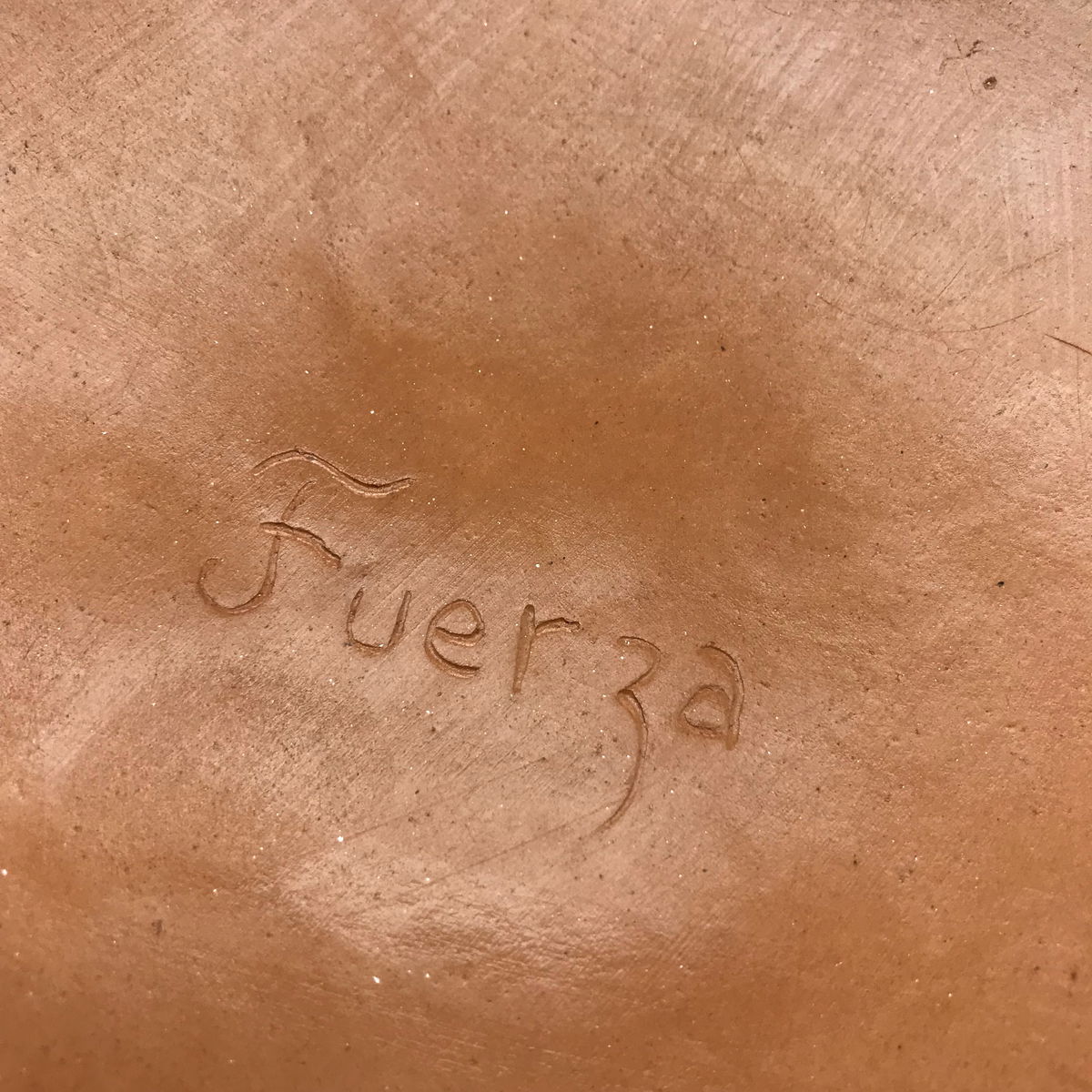 En el interior de la tapa, orientadas hacia los cuatro puntos cardinales, aparecen esgrafiadas medias chacanas concéntricas que expanden el símbolo hacia el agua que se filtra. Y allí, del lado interno, la palabra “fuerza” queda ofrecida directamente al agua. No como mandato, sino como memoria: la fuerza que sostiene, que permite seguir, que nace de estar en eje.